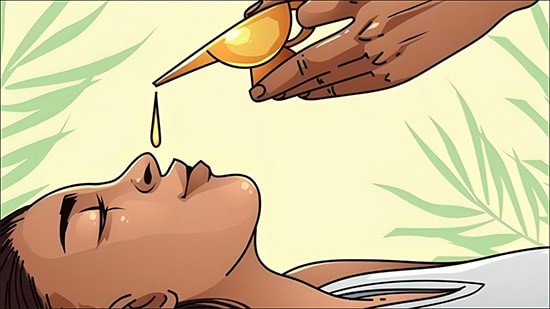 Nasya (Nasal Administration): Nasya involves the application of medicated oils or herbal powders into the nasal passages. This step effectively eliminates excess Kapha dosha and toxins from the head and neck region, benefiting conditions like sinusitis, headaches, respiratory and other various issues.